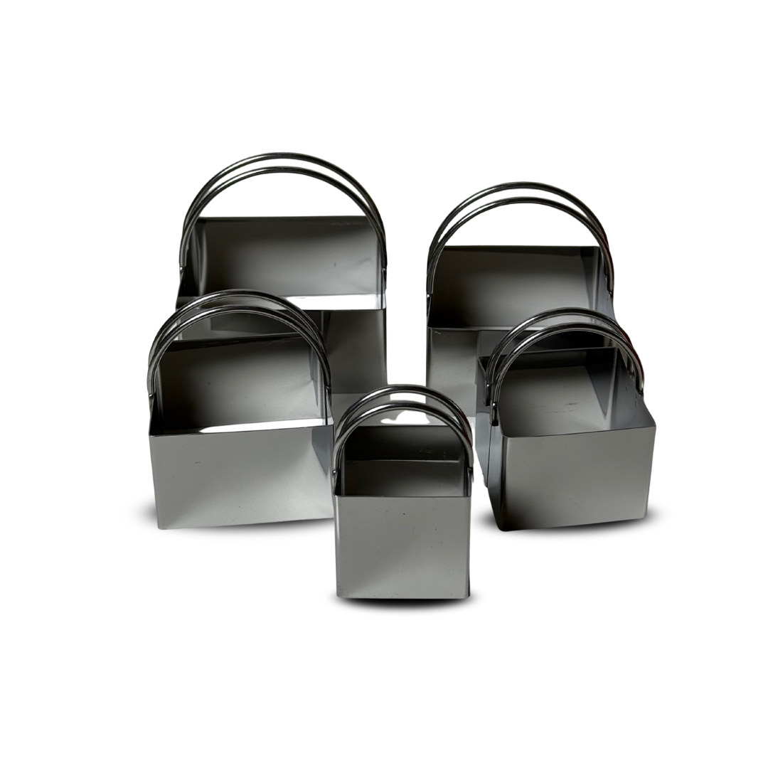 Set de 5 moldes ideales para cortar masas, bizcochos o postres con precisión. Fabricados en acero inoxidable resistente y fácil de limpiar.