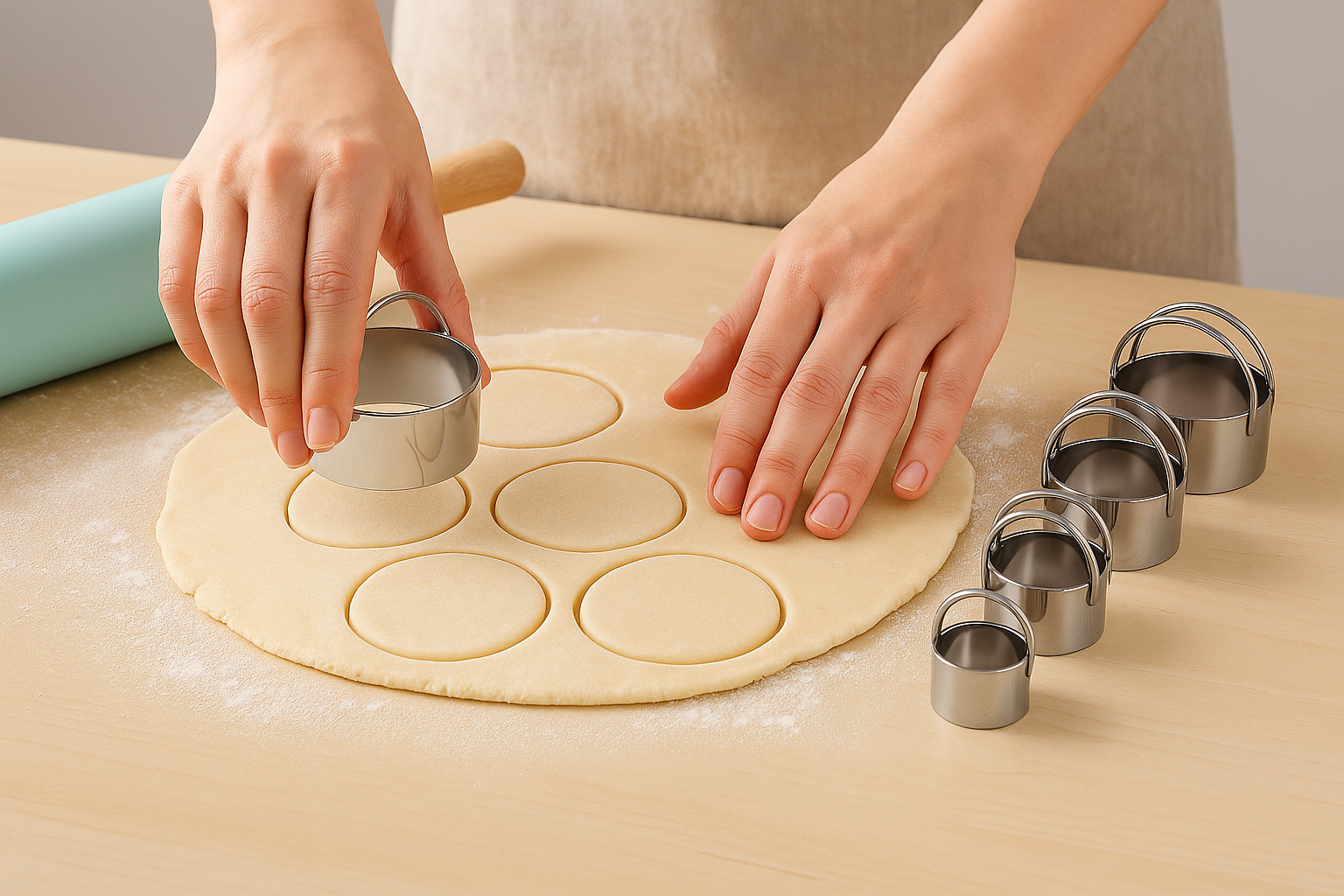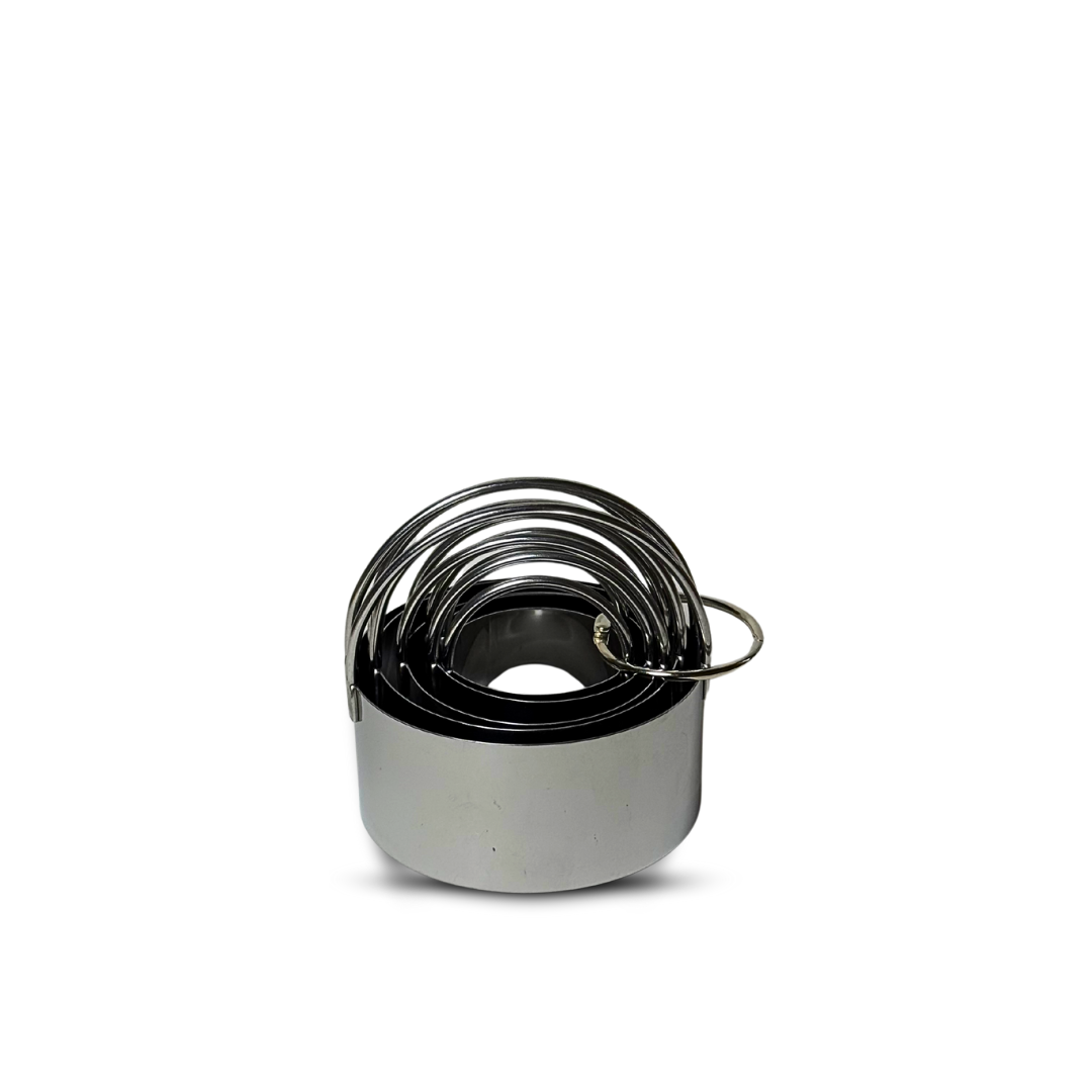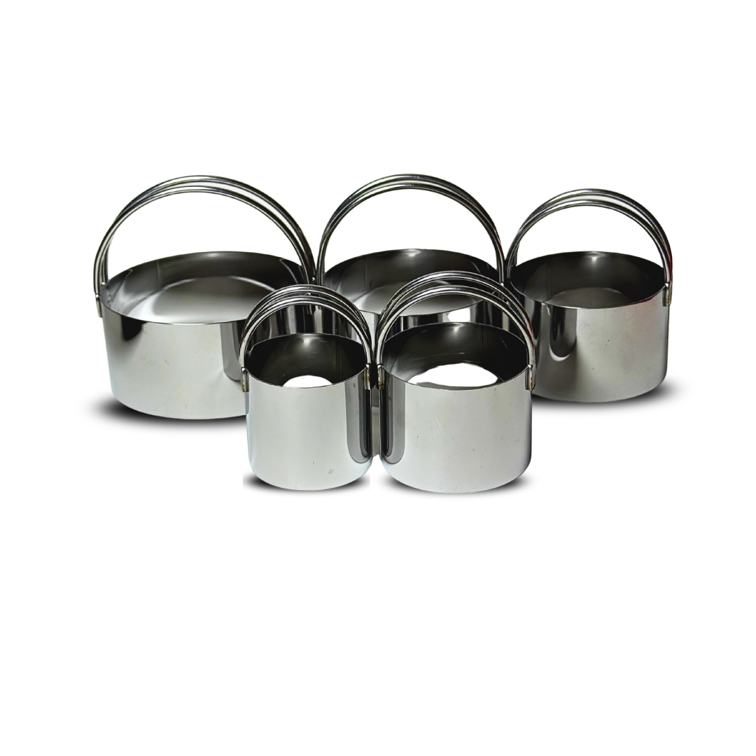 Incluye 5 tamaños: 4 cm, 5 cm, 6 cm, 7 cm y 9 cm de diámetro, con altura de 4 cm cada uno. Ideales para cortar masa, galletas o fondant. Fabricados en acero inoxidable resistente, fáciles de limpiar y duraderos.